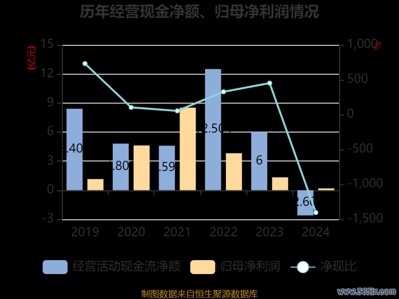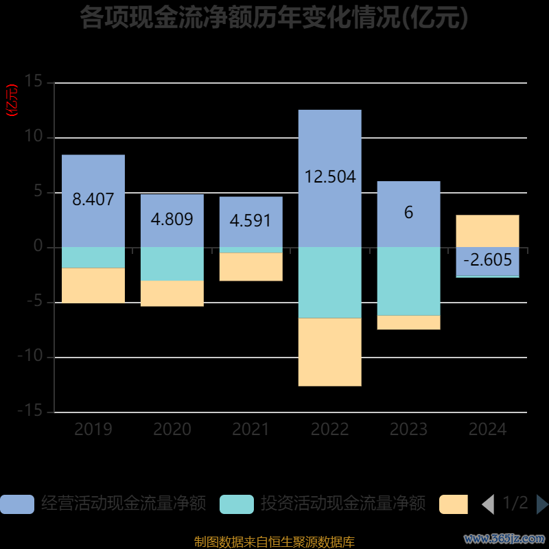 截至2024年,公司经营活动现金流净额为-2.61亿元,同比减少8.61亿元;筹资活动现金流净额2.92亿元,同比增加4.2亿元;投资活动现金流净额-1849.78万元,上年同期为-6.24亿元。