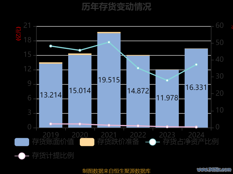 从存货变动来看利鸿网,截至2024年末,公司存货账面价值为16.33亿元,占净资产的37.27%,较上年末增加4.35亿元。其中,存货跌价准备为551.61万元,计提比例为0.34%。